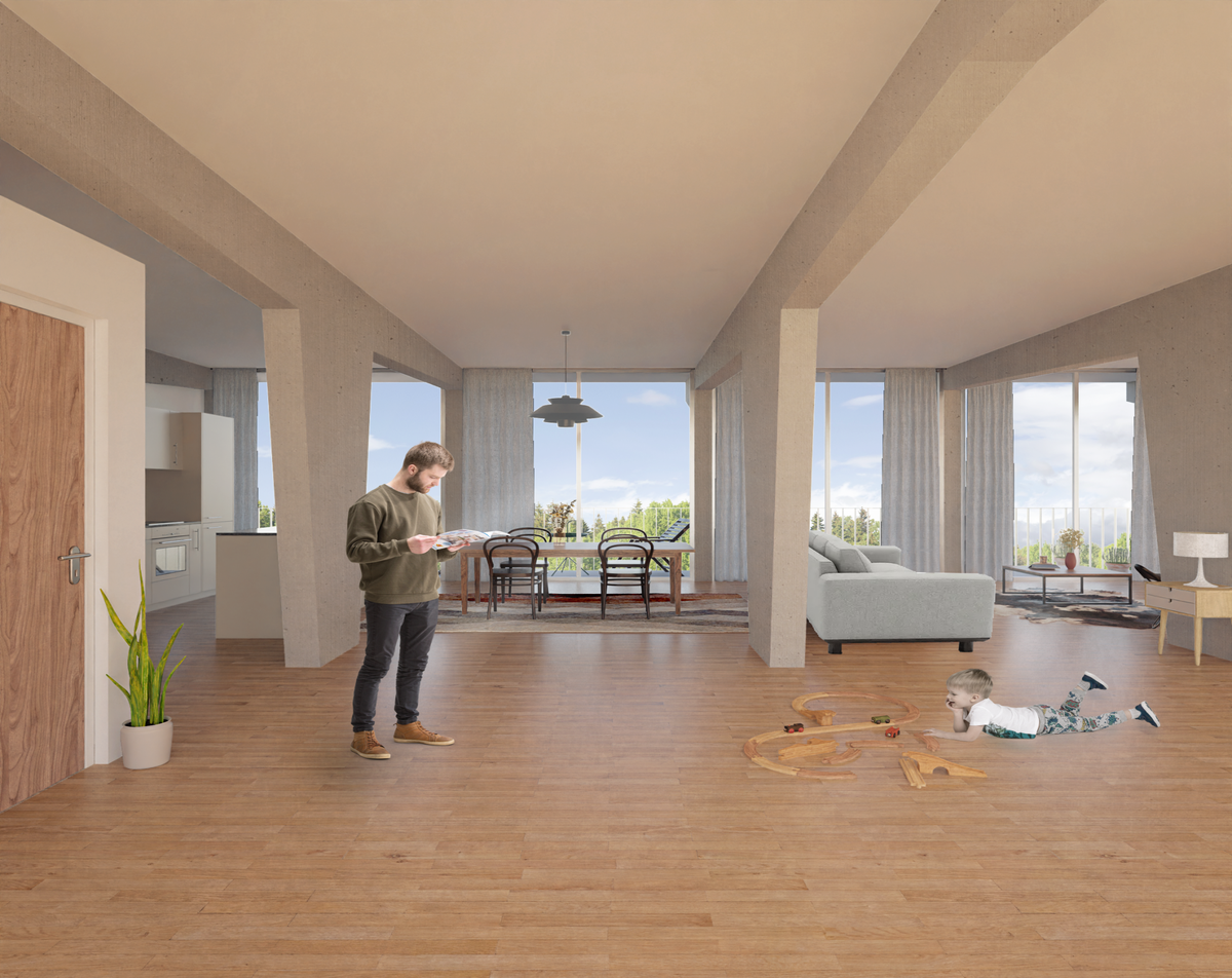 Réalisé en binôme, ce projet de 2020 propose un immeuble de 450 appartements. Le bâtiment, du haut de ses 40 mètres, domine la partie résidentielle de Chêne-Bourg. L’idée d’une construction de 13 étages dans une zone villa ne dépassant pas les 3 niveaux peut paraître surprenante. L’année suivante, le grand public découvrira le projet de la Tour Opale (Prix Pritzker 2021) qui surplombe désormais ce quartier de ses 57 mètres. La répétition d’une même structure, le portique en T, permet d’optimiser à l’extrême l’usage du béton préfabriqué. Ce portique permet de créer une trame de 2,60m. Les salles de bain sont intégrées sous la